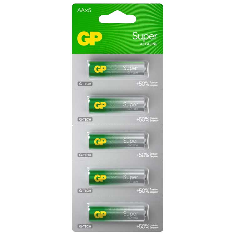 Батарейки GP LR6 Super Alkaline G-TECH 15AA21-2CRSC5 BL5 имеют емкость 2500 mA h