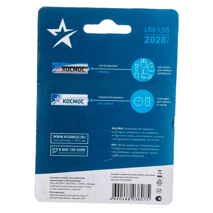 Батарейки Космос LR6 Alkaline KOCLR6BL8 BL8 имеют емкость 2400 mA h