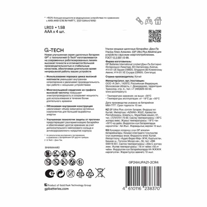 Батарейки GP LR03 Ultra+ Plus G-TECH 24AUPA21-2CR4 BL4 имеют емкость 1500 mA h